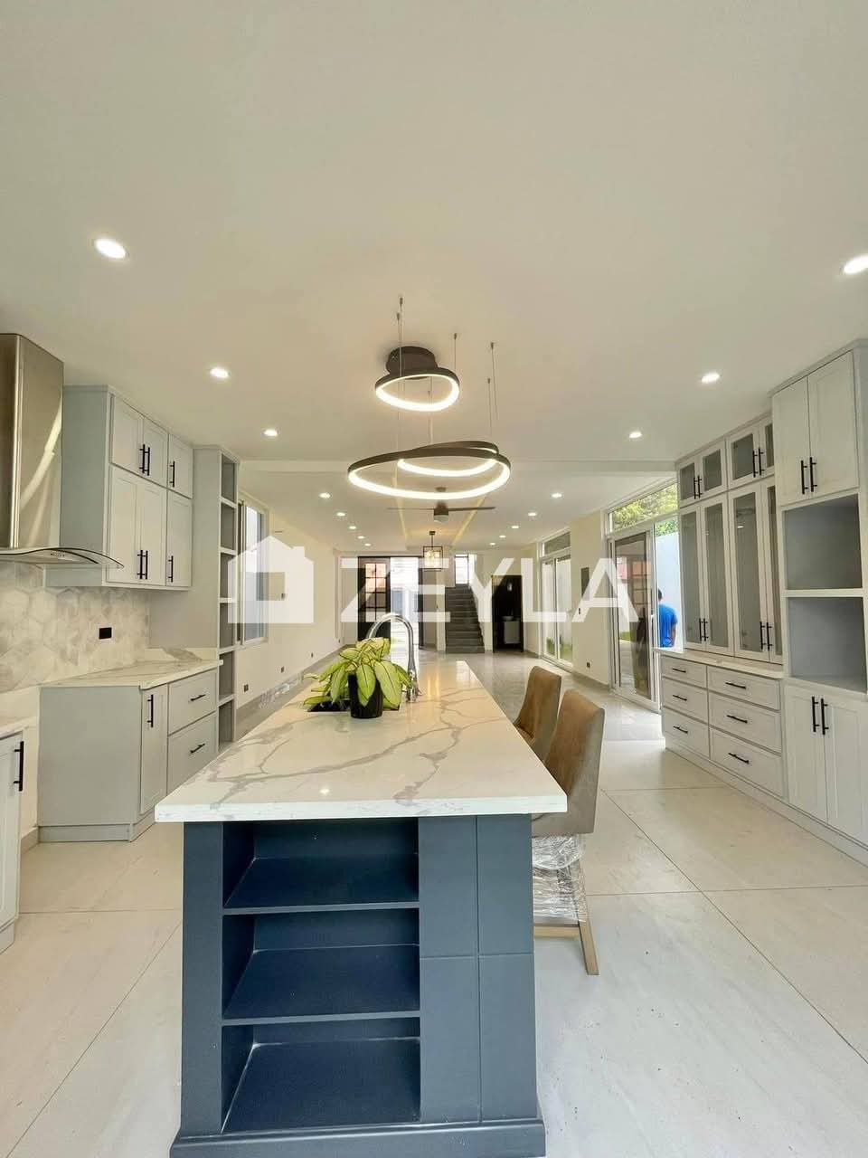 • Cocina con muebles de madera e isla con encimera de cuarzo.